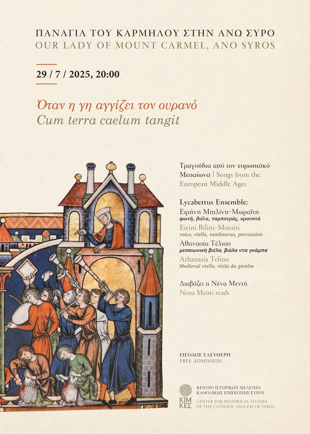Το Κέντρο Ιστορικών Μελετών της Καθολικής Επισκοπής Σύρου (ΚΙΜΚΕΣ) σε συνεργασία με το LycabettusEnsemble σας προσκαλούν στη μουσική εκδήλωση με τραγούδια από τον ευρωπαϊκό Μεσαίωνα με συνοδεία από μεσαιωνικές βιέλες, ταμπουρά, ούτι και κρουστά.