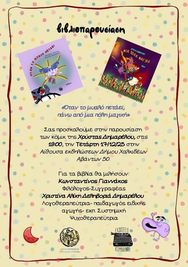 Την Τετάρτη 17 Δεκεμβρίου και ώρα 19.00, στην αίθουσα εκδηλώσεων του Δήμου Χαλκιδέων (Αβάντων 50 -1ος όροφος) στη Χαλκίδα, θα πραγματοποιηθεί η παρουσίαση των βιβλίων της Χρύστας Δημαρέλου «Όταν το μυαλό πετάει» και «Μια πόλη μαγική».