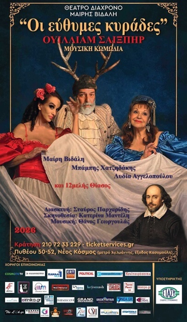 Από το Σάββατο 31 Ιανουαρίου στο ΔΙΑΧΡΟΝΟ ΘΕΑΤΡΟ ΜΑΙΡΗΣ ΒΙΔΑΛΗ, θα απολαύσουμε την σπαρταριστή κωμωδία «Οι εύθυμες Κυράδες (του Ουίνζορ)» του Ουίλλιαμ Σαίξπηρ σε μορφή μιούζικαλ.